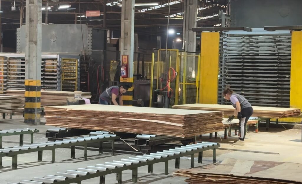A madeireira onde Hermes e Geraldi trabalham tem 25 anos de atuação e fabrica portas e compensados. Metade da produção é exportada, quase toda para o mercado norte-americano.