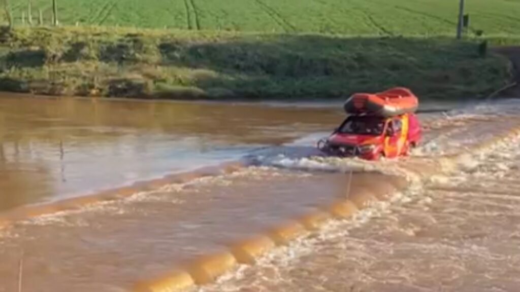 Um vídeo que circula nas redes sociais mostra uma viatura dos bombeiros em ação na região durante a operação.