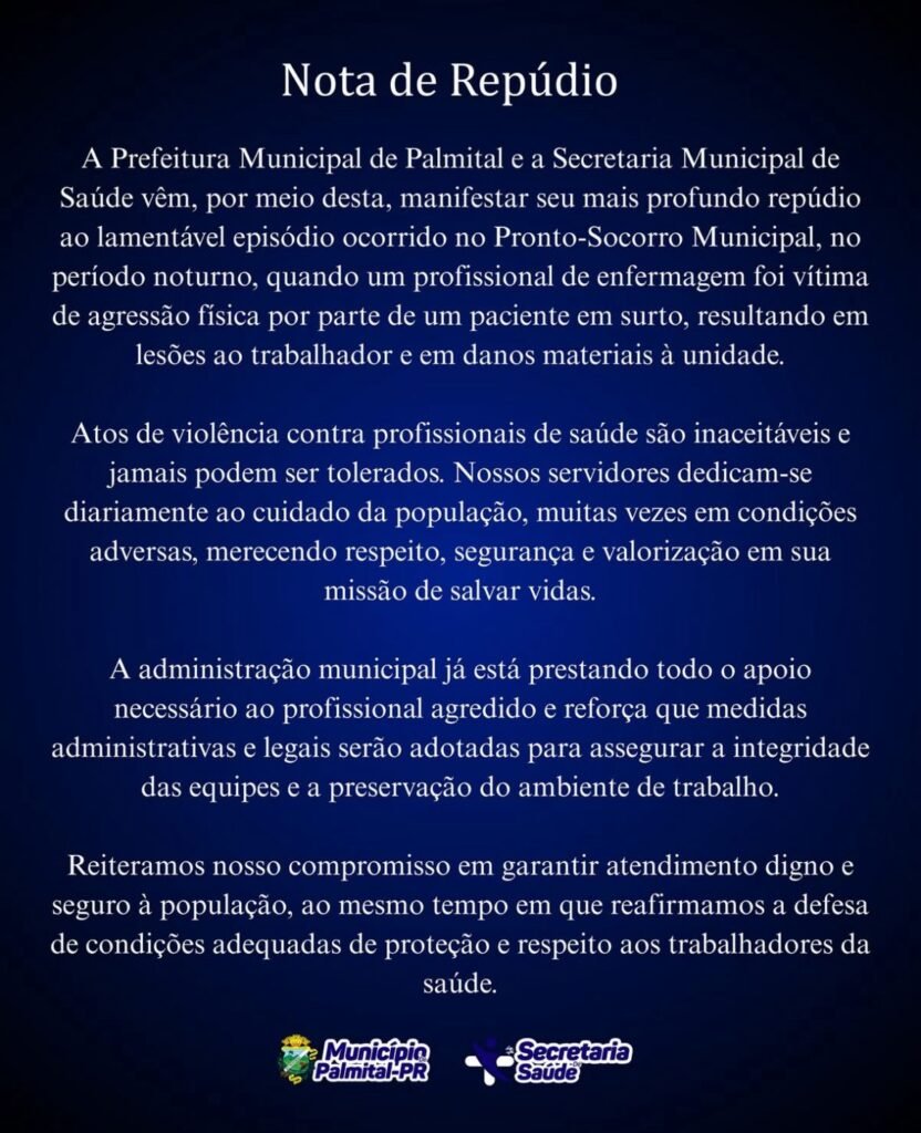 Após a repercussão do caso, a Prefeitura de Palmital divulgou uma nota de repúdio, destacando que não vai tolerar agressões contra servidores da saúde e que acompanha o caso em conjunto com as autoridades de segurança.