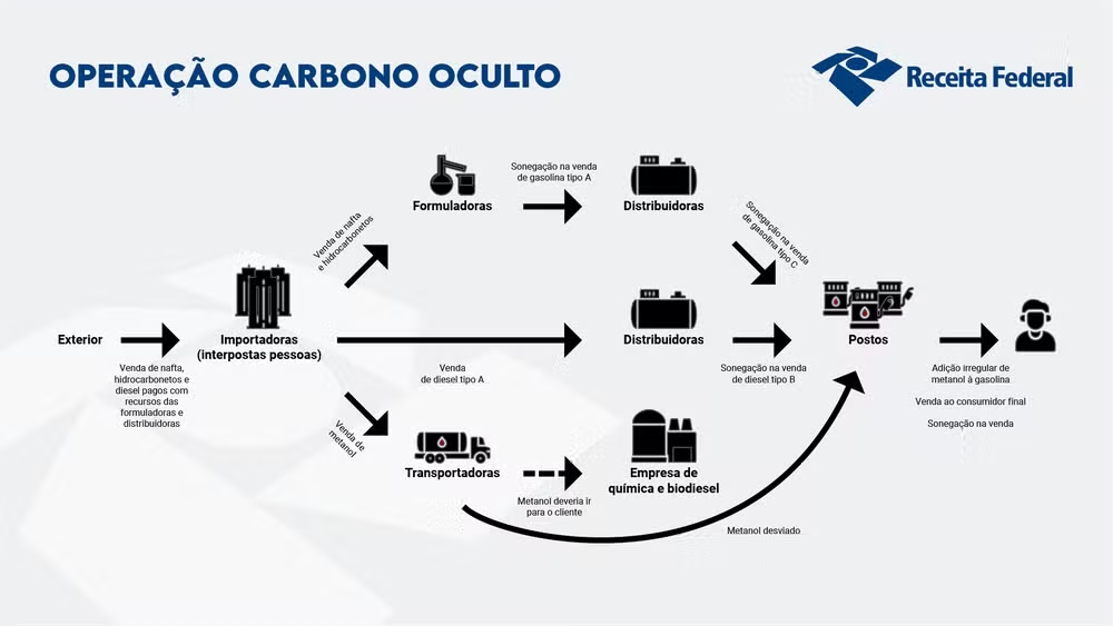 De acordo com as investigações, mais de 350 pessoas físicas e jurídicas são suspeitas de crimes como sonegação, fraude fiscal, estelionato, crimes ambientais e contra a ordem econômica. O metanol, importado pelo Porto de Paranaguá (PR), era desviado de forma clandestina, usado para adulterar combustíveis e vendido sem segurança, colocando em risco motoristas e consumidores.