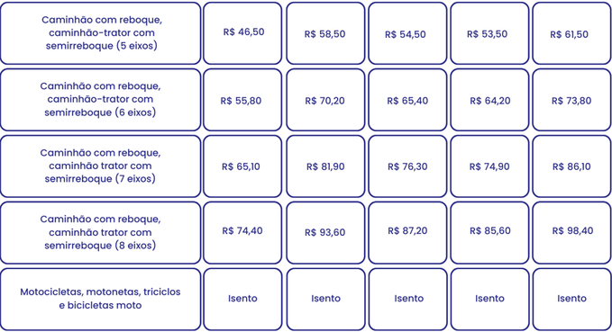 Com isso, o preço para veículos leves (categoria 1) passou a ser: