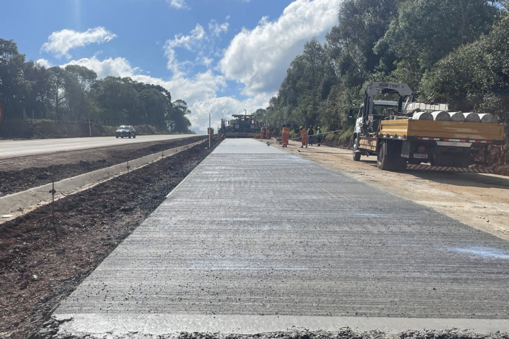 A principal obra de arte especial, a nova ponte sobre o Rio Coutinho, já está concluída. Também estão em fase final a terraplenagem da nova pista e a recuperação da via existente, que recebe uma nova camada de concreto rígido — técnica conhecida como whitetopping. Este serviço representa o maior investimento individual da empreitada e já alcançou 50% de execução.