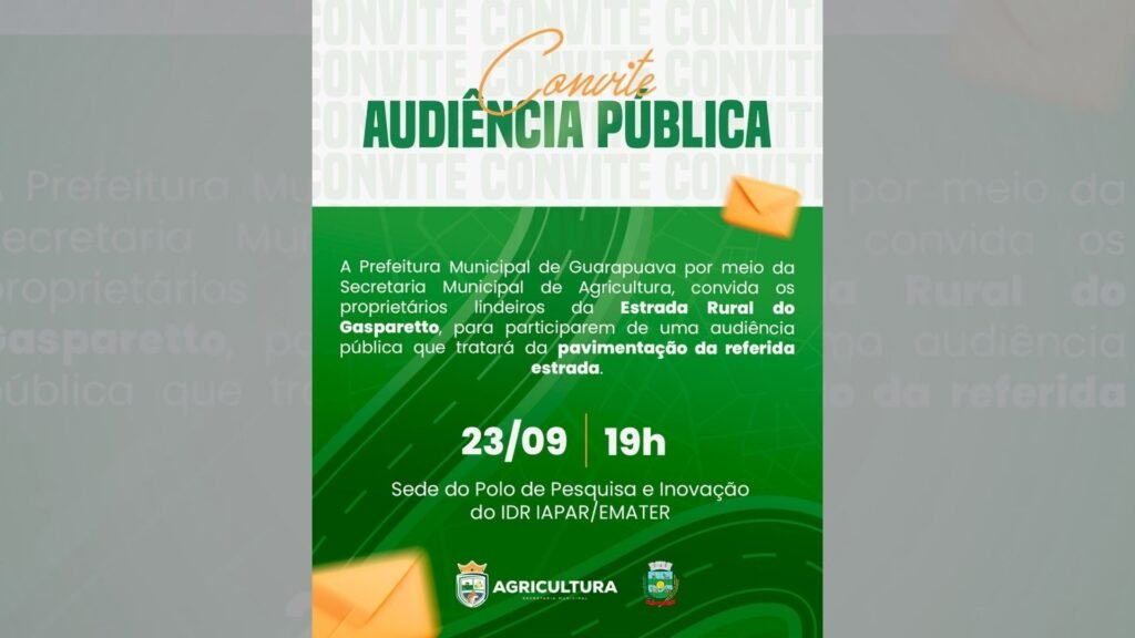 A Prefeitura de Guarapuava, por meio da Secretaria Municipal de Agricultura, realiza na noite desta terça-feira (23) uma audiência pública para tratar da pavimentação da Estrada Rural do Gasparetto.
