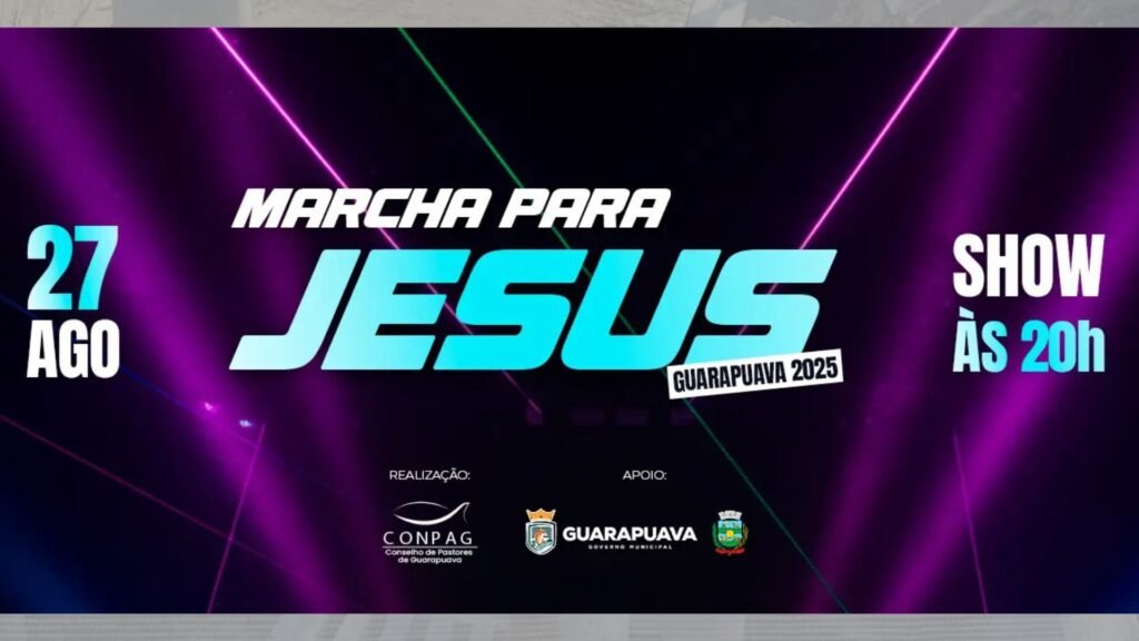 O Conselho de Pastores de Guarapuava (Conpag), com apoio da Prefeitura Municipal, realiza neste sábado (27) a Marcha para Jesus 2025. A concentração será em frente à Prefeitura, na Praça Cândido Xavier, a partir das 13h.