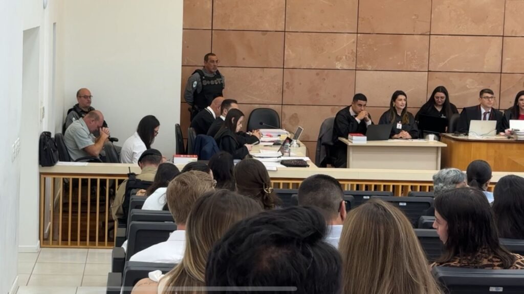 A sala do tribunal está completamente lotada. Rodrigo está posicionado no canto esquerdo, atrás dos advogados de defesa, de lado para o público. À frente, estão os representantes do Ministério Público e os advogados da família das vítimas. No canto direito, ficam os jurados. Todas as cadeiras da plateia estão ocupadas, e a imprensa foi autorizada a acompanhar o julgamento na primeira fileira. Não é permitido registrar imagens durante a sessão, mas foi autorizada a gravação do ambiente antes do início dos trabalhos.