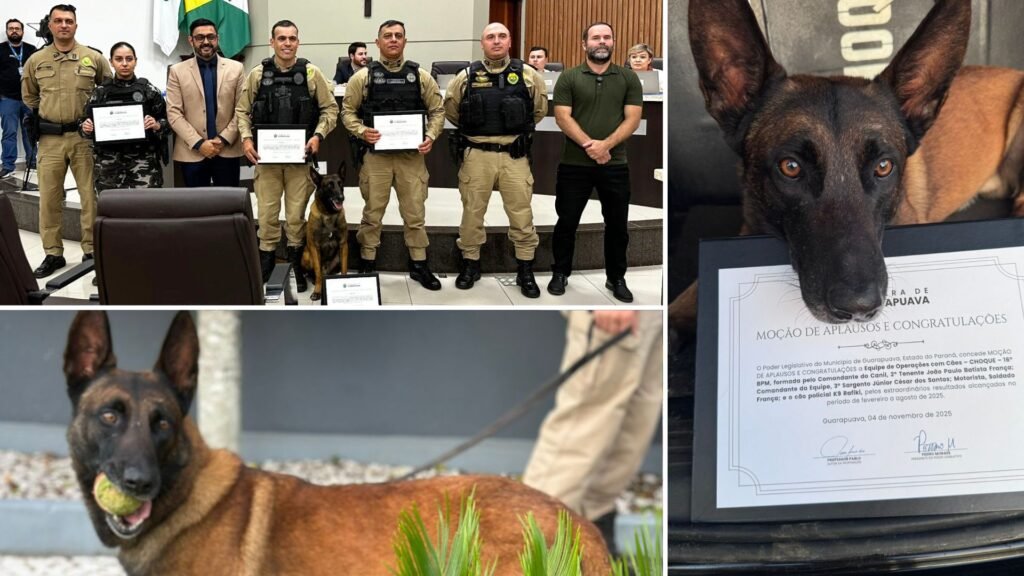 A Câmara de Vereadores de Guarapuava entregou, ontem (4), uma moção de aplausos e congratulações à equipe de Operações com Cães do Choque, do 16º Batalhão da Polícia Militar, em reconhecimento aos resultados alcançados nas ações de segurança pública entre fevereiro e agosto deste ano. A homenagem também contemplou o cão policial K9 Rafiki, que tem se destacado em operações de combate ao tráfico e na localização de armas e drogas.