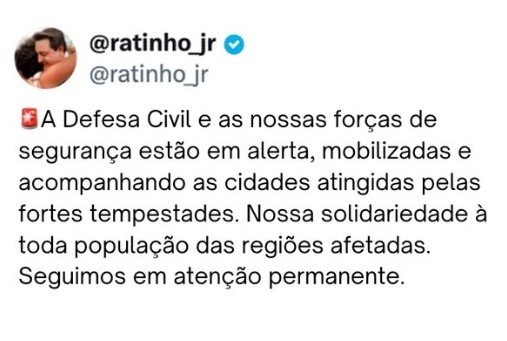 “A Defesa Civil e as nossas forças de segurança estão em alerta, mobilizadas e acompanhando as cidades atingidas pelas fortes tempestades. Nossa solidariedade à toda população das regiões afetadas. Seguimos em atenção permanente.”