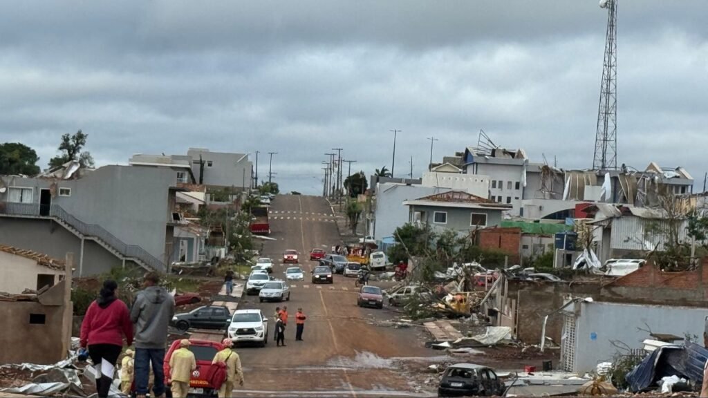 A Copel também atua no município, priorizando o religamento de áreas menos afetadas. Cerca de 10% da cidade já teve a energia restabelecida, e novas equipes foram deslocadas com caminhões de serviço pesado para auxiliar na reconstrução.