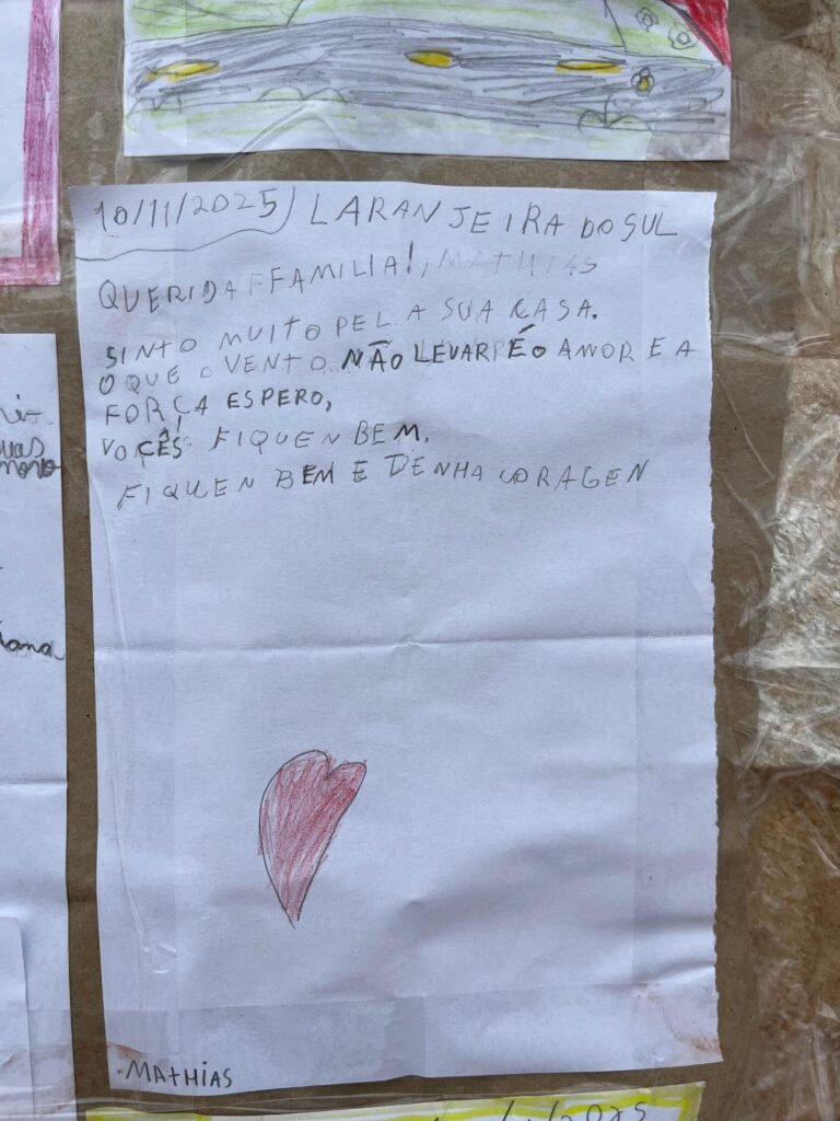 “Querida família, sinto muito pela sua perda. Sei que vocês irão reconstruir tudo. O vento levou telhado, paredes, móveis, mas eu sei que a força de vocês é grande e Deus vai te ajudar. Tenha fé”, escreveu a aluna Maisa, de 7 anos.