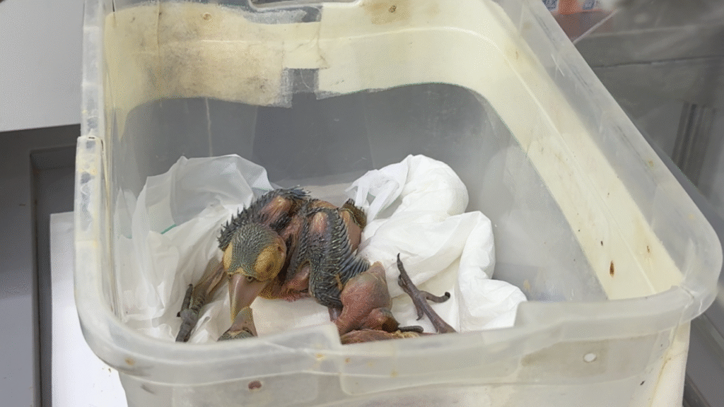 No laboratório, a equipe mostrou o atendimento aos três filhotes de tucano-de-bico-verde, que tiveram o ninho destruído pela força do tornado em Rio Bonito do Iguaçu. Eles estão em uma incubadora com temperatura controlada.