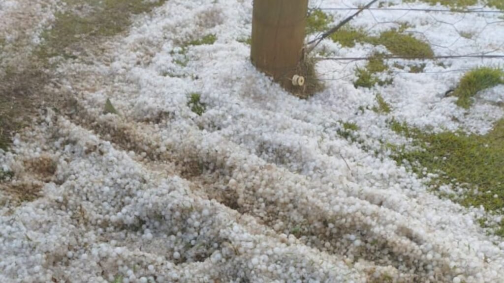 O temporal não ficou restrito a Guarapuava. Em Laranjeiras do Sul, moradores da comunidade de Rio do Tigre registraram cenas impressionantes. Imagens que circulam nas redes sociais mostram até um carrinho de mão cheio de granizo e o gramado completamente branco, coberto pelas pedras de gelo que caíram durante a tarde.