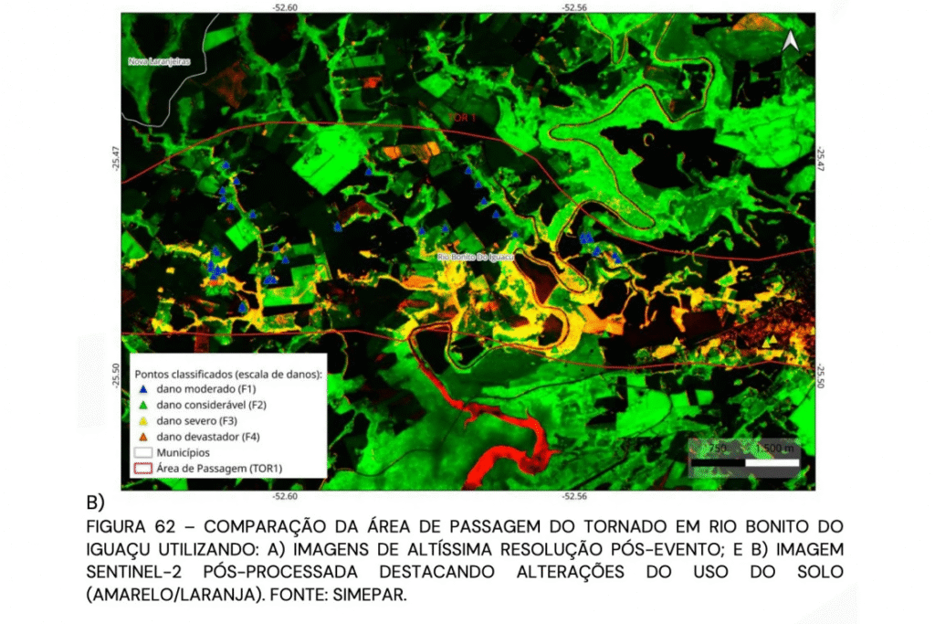 O Simepar divulgou nesta semana o laudo técnico completo sobre os tornados que atingiram o Paraná no dia 7 de novembro, elevando para F4 a classificação dos fenômenos que devastaram Rio Bonito do Iguaçu e parte de Guarapuava. O documento, com mais de 130 páginas, reúne análises de radar, imagens aéreas, registros em solo e dados meteorológicos, e aponta que este episódio está entre os mais intensos registrados no Estado nas últimas três décadas.