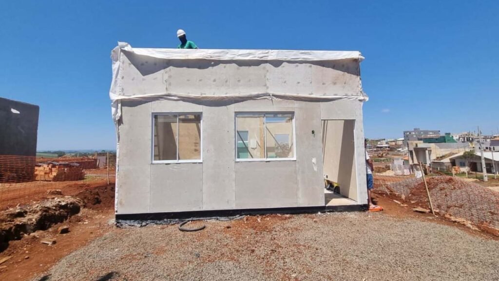 Os trabalhos começaram na quarta-feira (3), com a fundação rasa, etapa em que também são instaladas as redes elétrica, hidráulica e de gás. Durante o fim de semana (6 e 7), a estrutura principal foi erguida: paredes pré-montadas, com esquadrias e instalações já incorporadas, e a colocação do telhado. Agora, a obra entra no estágio final, com assentamento de cerâmica, pintura, aplicação de gesso e instalação de louças e metais.