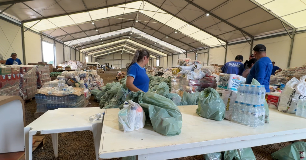 Em um dos barracões ficam as cestas básicas e os kits de higiene e limpeza. No outro, estão organizados os produtos para obras: portas, cimento, cal, madeira, tijolos, tubulações, cerâmica e outros materiais usados na reconstrução de casas. A ideia é que quem precisa de comida e itens essenciais siga uma logística, e quem precisa de material de construção seja atendido em outro fluxo, ligado ao setor de obras.