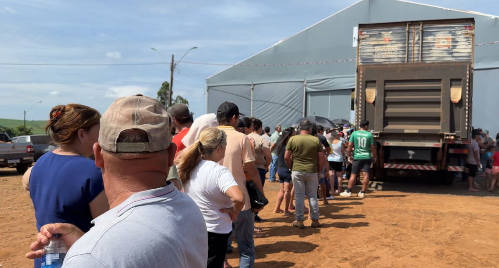 Entre os muitos rostos da fila, um deles chama atenção pelo jeito simples e pela fala emocionada: dona Irene Henrique de Jesus, moradora da área rural. Ela veio buscar uma cesta básica para reforçar a despensa de casa. Vive no sítio, é aposentada e já morou quase vinte anos em Curitiba, para tratamento de saúde, antes de decidir voltar ao interior.