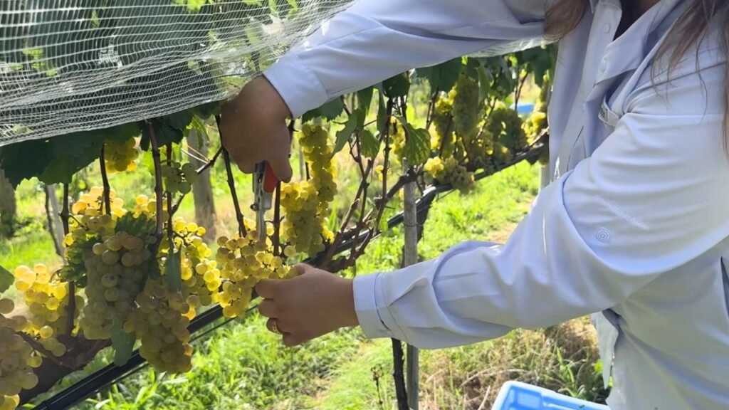 Segundo ela, a ideia é oferecer uma experiência de campo, onde dá para caminhar entre as parreiras, ver os peixes no lago e, na época certa, até colher uva no pé, coisas simples, mas que muita gente já não vive mais no dia a dia.