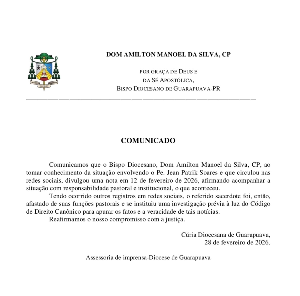 A Diocese também afirmou, na ocasião, que estava à disposição para colaborar com as autoridades dentro dos limites da lei e destacou que o bispo diocesano acompanhava o caso com responsabilidade pastoral e institucional.