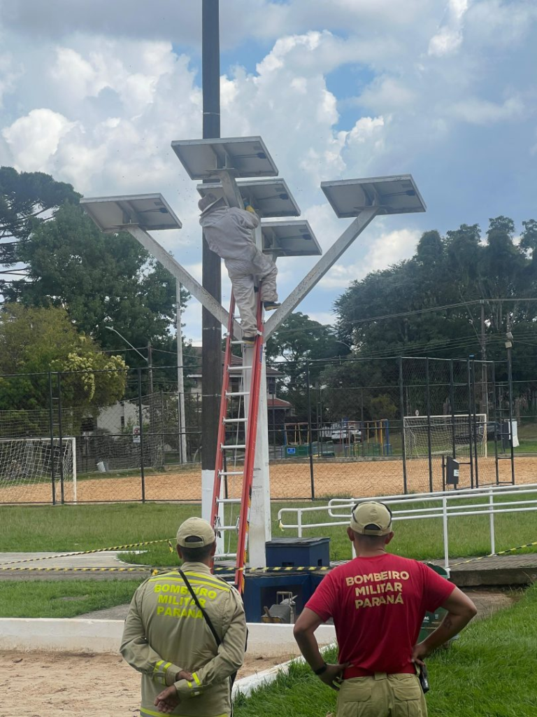 O Corpo de Bombeiros realizou, neste domingo (8), a interdição temporária do parquinho da Praça Ucrânia devido à presença de um enxame de abelhas no local.