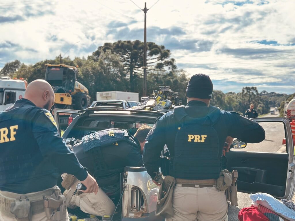 Diante da situação, a equipe aprofundou a fiscalização e identificou sinais de alteração nas lanternas traseiras e no banco traseiro do automóvel. Após a abertura dos compartimentos ocultos, foram encontrados diversos aparelhos celulares. Parte da carga também estava escondida embaixo e atrás do banco traseiro.
