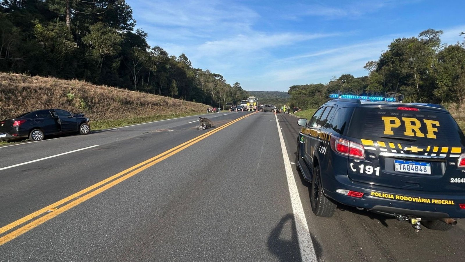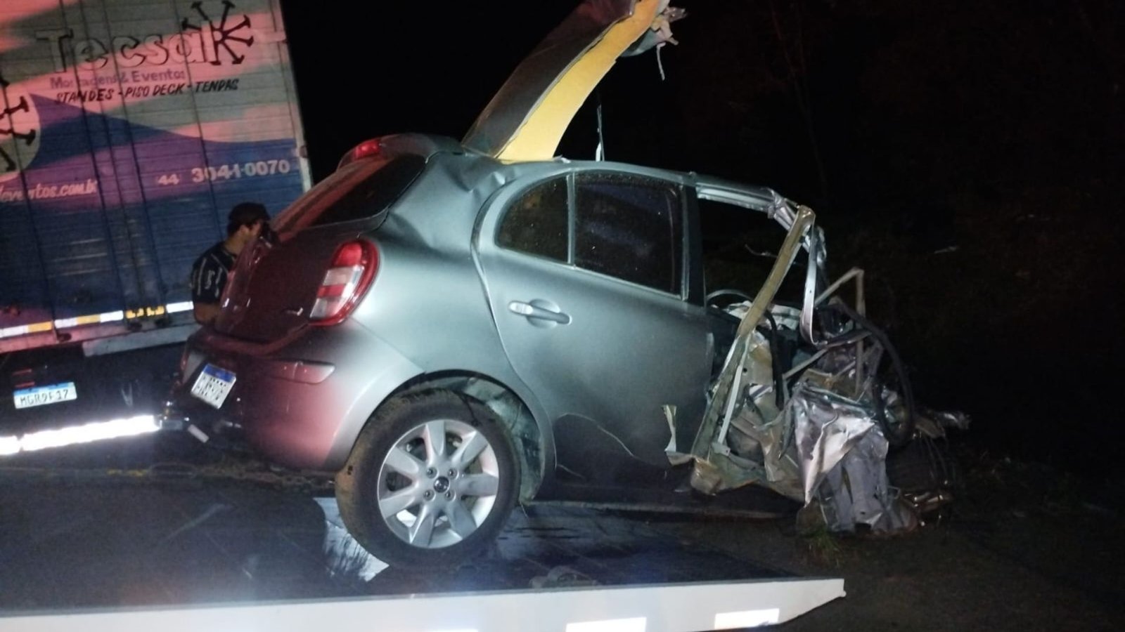 Carro bate de frente em caminhão e depois atinge outro veículo na PRC-466 em Turvo; motorista fica ferido